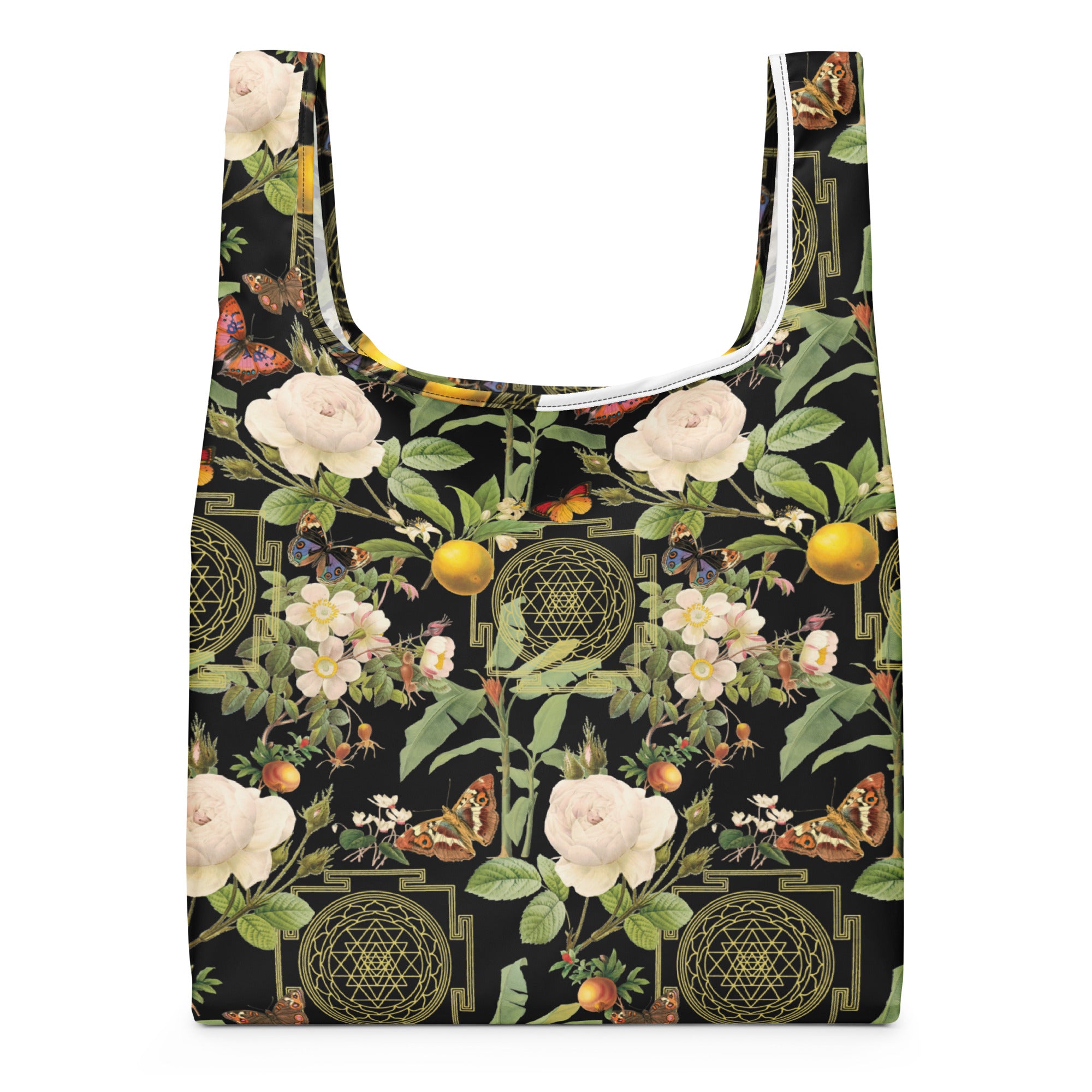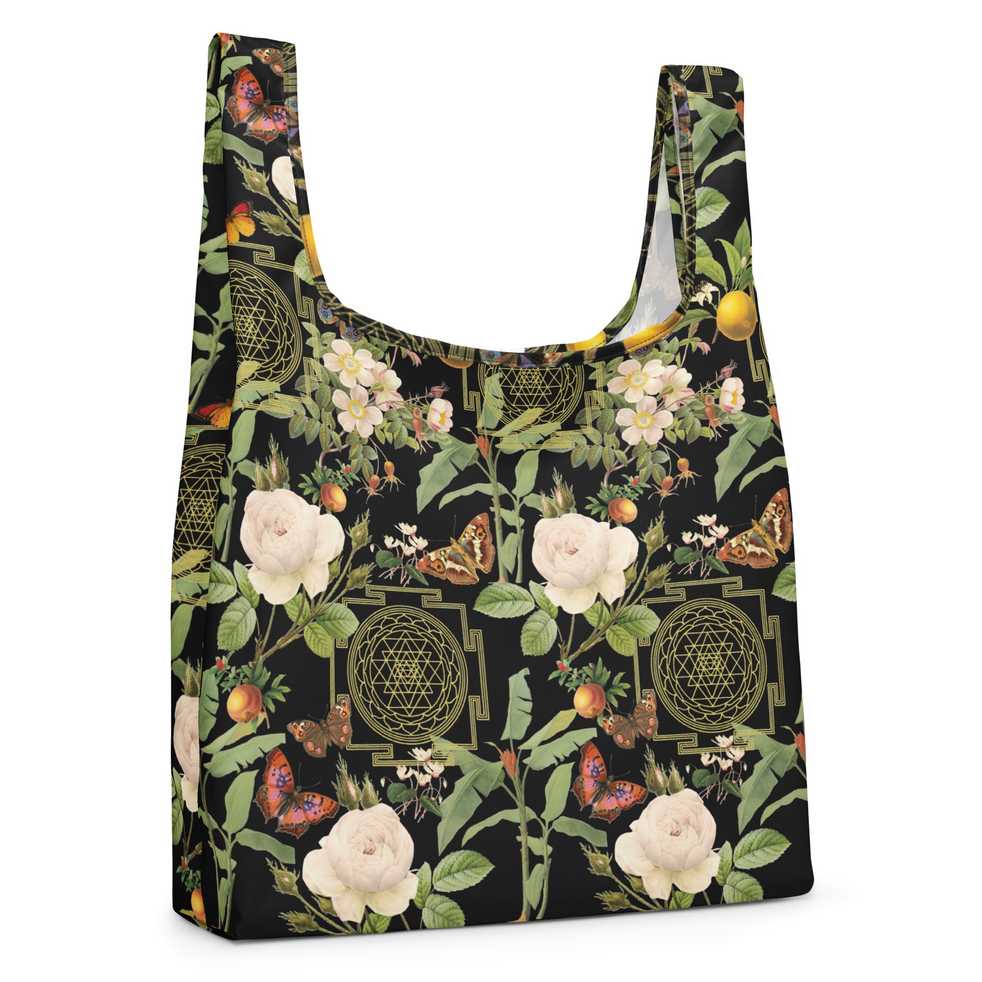 Sri Yantra Yogi reusable shopping bag- is a stylish and symbolically powerful bag to use on your next shopping trip! Replace single-use plastic bags with this stylish, handy shopping bag that you can keep in your purse or pocket. It’s light yet sturdy, and has handles as part of the construction for extra durability. Easy to wash!